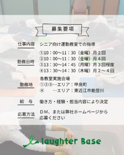 laughter Base(ラフターベース)では、業務拡大に伴い、シニア向け運動教室の指導スタッフを募集しています!